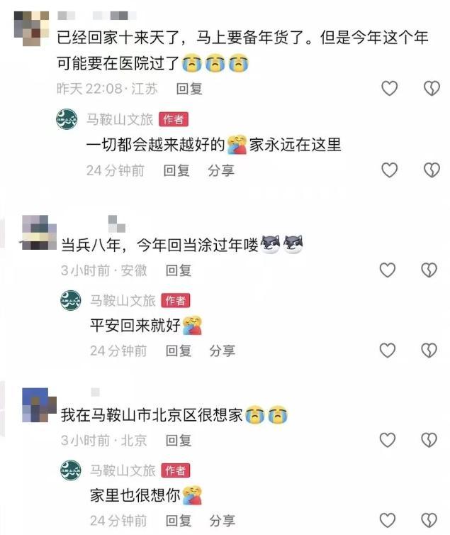 他们也会针对这些生活近况进行回复,比如网友说“家里人有生病了,年可能要在医院过了”,我们回复“一切都会好的,大家都平平安安的”;还有人说“我当兵八年了,今年第一年回到马鞍山过年”,我们会回复“平安归来就好”。