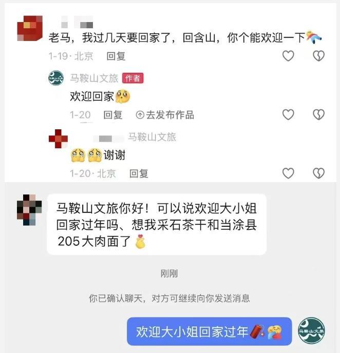 “个性化定制”是各地文旅账号回复家乡游子的“法则”。运营安徽马鞍山文旅账号的马鞍山市新闻传媒中心工作人员尹韵竹坦言,面对网友们的热情互动,在力所能及的范围内,她都努力让这些留言被认真对待。