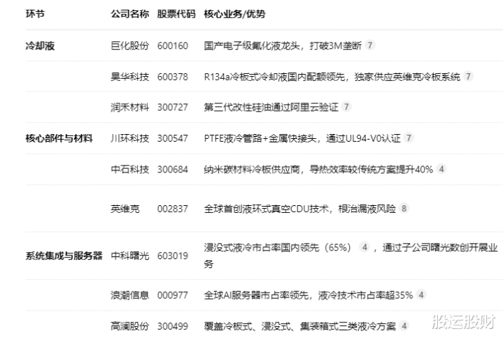 其产业链上游的冷却液(如巨化股份)、核心部件(如英维克、川环科技)技术壁垒高,是国产化和价值核心。中游的系统集成与服务器厂商(如中科曙光、浪潮信息)则直接受益于行业需求的爆发。