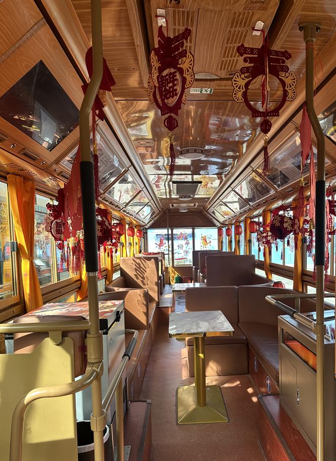 此次主题装扮覆盖仿古铛铛车、数字双层观光巴士等车型,按照线路特色分类营造节日氛围。其中,中轴线夜游观光巴士车厢内精心布置马年窗花、非遗年画、新春对联、彩色拉花、马年福字、兔爷全家福摆件、传统宫灯、生肖装饰与中国结,将非遗技艺与生肖文化巧妙融合,一步一景皆显京韵年俗。前门故宫环线观光巴士、长安街夜景观光巴士则以简约喜庆为基调,搭配窗花、马年福字、生肖灯笼与中国结,营造温馨节日氛围。