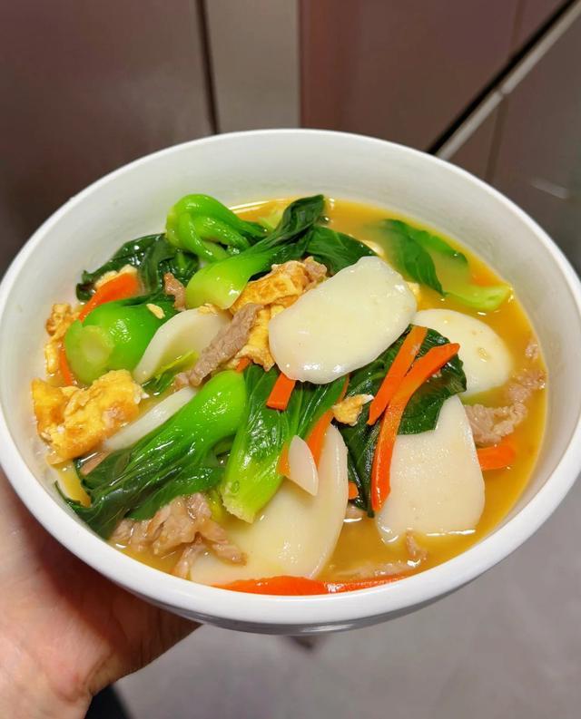 看,汤色是清亮的淡茶色,年糕白糯,青菜碧绿,蛋花金黄。