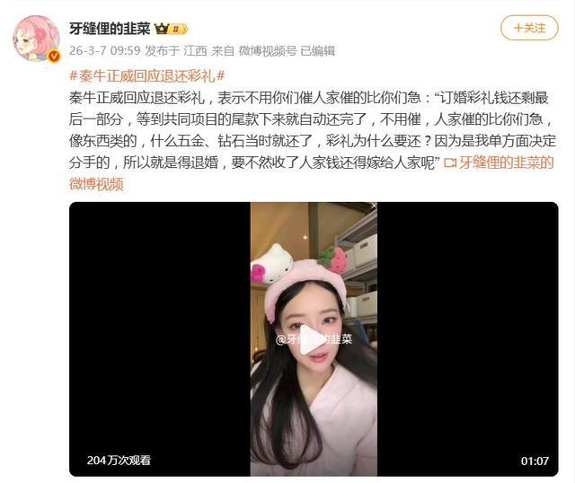 事情得从2026年2月的一场直播说起。秦牛正威的前男友孔语浩在直播中一句女方“要求两次彩礼”的模糊指控,瞬间点燃了舆论。结合两人从2023年2月官宣、7月高调订婚(秦牛正威甚至为爱改名“秦语鹿”)、到2024年12月女方单方面宣布分手的“闪订闪分”剧情,网友的质疑声浪不难理解:婚约解除了,那当初的彩礼呢?